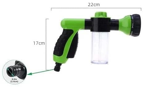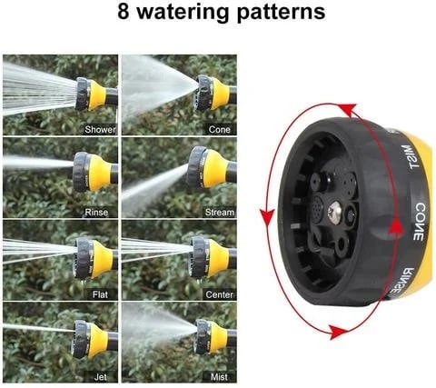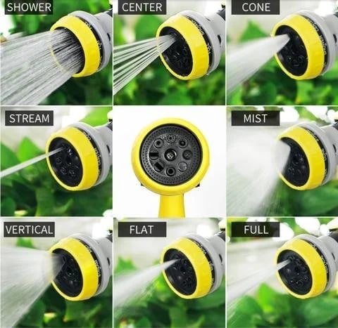 The foam gun has 8 types of spouts .spin- click spray selector different settings ( rinse. stream. flat. center. jet. shower. mist and cone) which can spout water in 8 patterns for different uses. spray nozzle for garden hose fulfill your different needs. Best for Watering Plants. Lawn. Patio. and Washing Car. Showering Pets.
