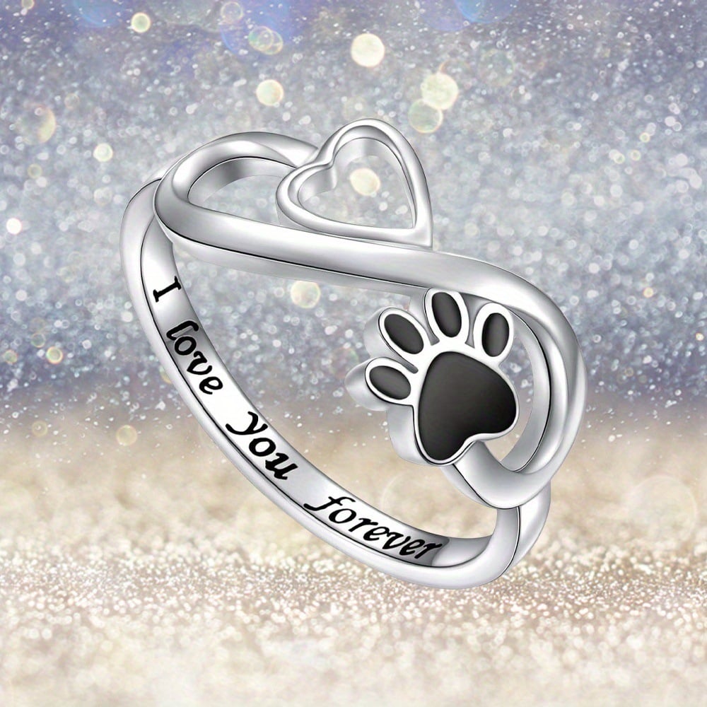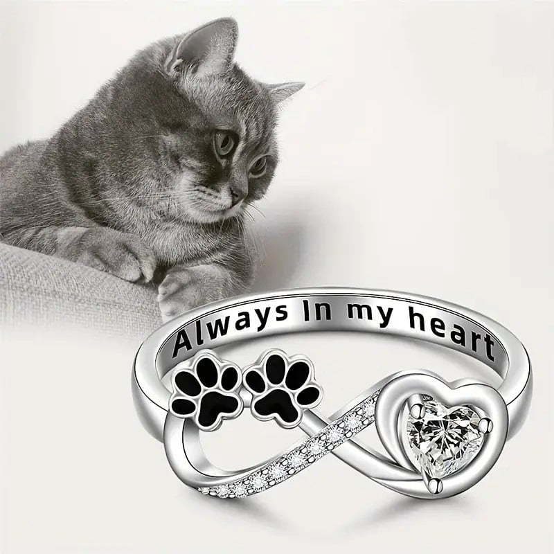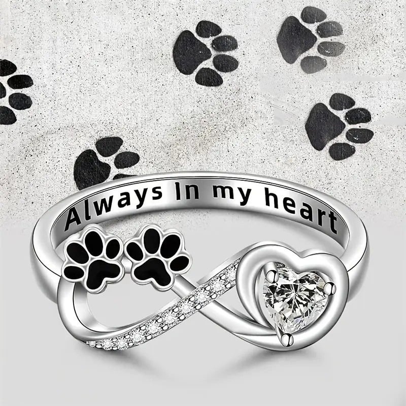 Featuring two black paw prints joined with an infinity symbol. a shimmering heart-shaped crystal. and the engraved message “Always In My Heart”. every detail speaks of eternal love and loyalty. The ring’s smooth finish and high-quality craftsmanship offer both beauty and comfort for everyday wear.