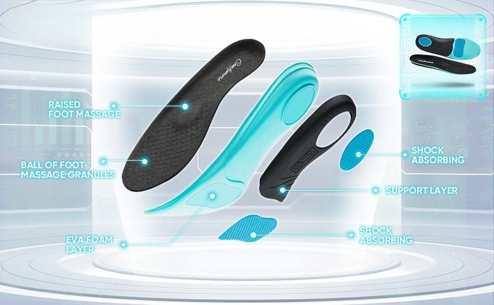 - ★PREMIUM QUALITY INSOLE----The orthotic insole offers strong arch support made of hard TPU and cushioning layer with PU memory foam base- works wonders to enhance comfort and ease pain on the foot and heel.Latex metatarsal pad support help relieve foot pressure and fatigue.Massaging gel waves absorb shock and provide cushioning for all-day comfort, its rugged construction withstands the impact and forces exerted on your feet. the particles on the inserts cover massage your feet while you walk.