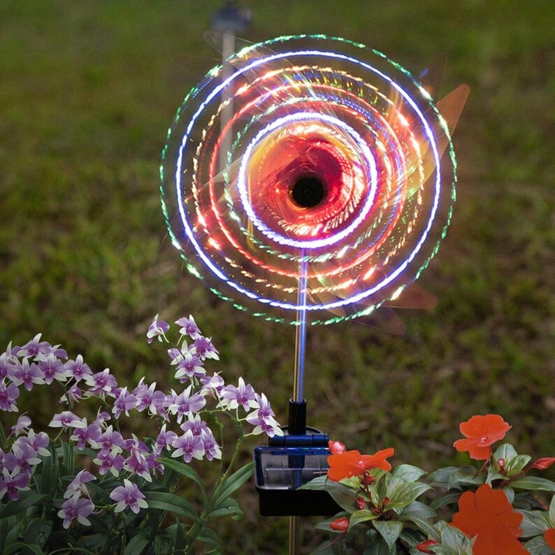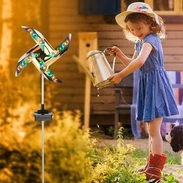 【Shining dreamy lights】The solar wind spinner is powered by solar panels. At nightfall. the windmill will light up with flashing lights in four colors: red. yellow. blue and green. The four blades will rotate continuously with the light cone.